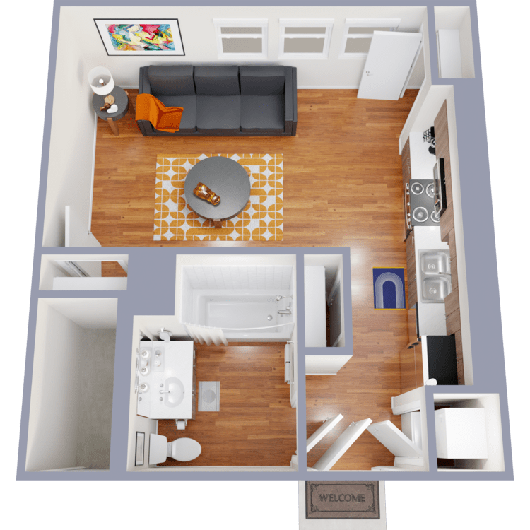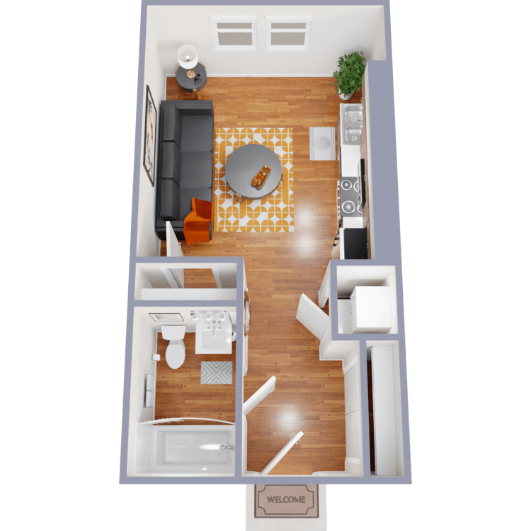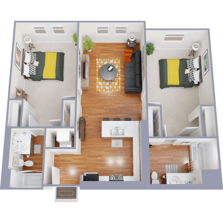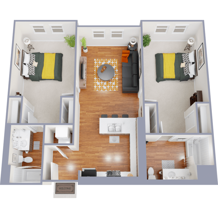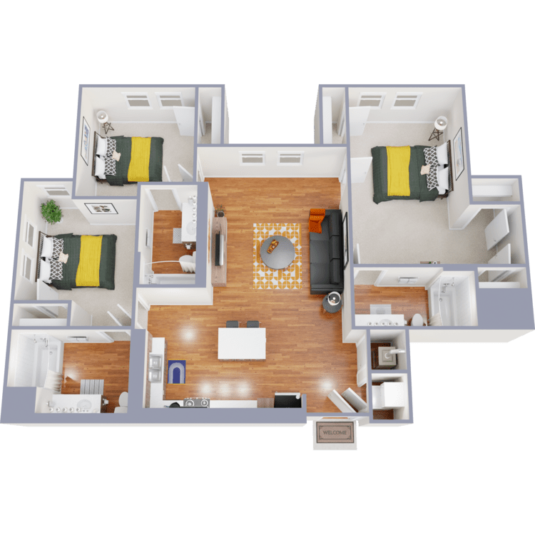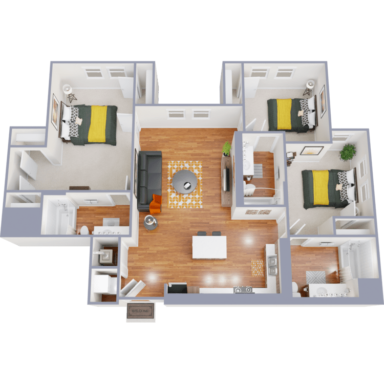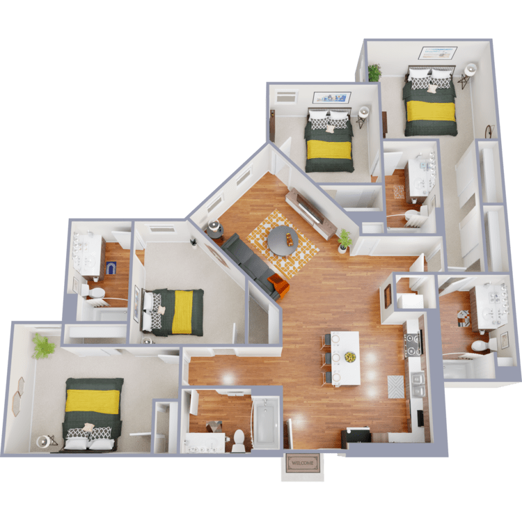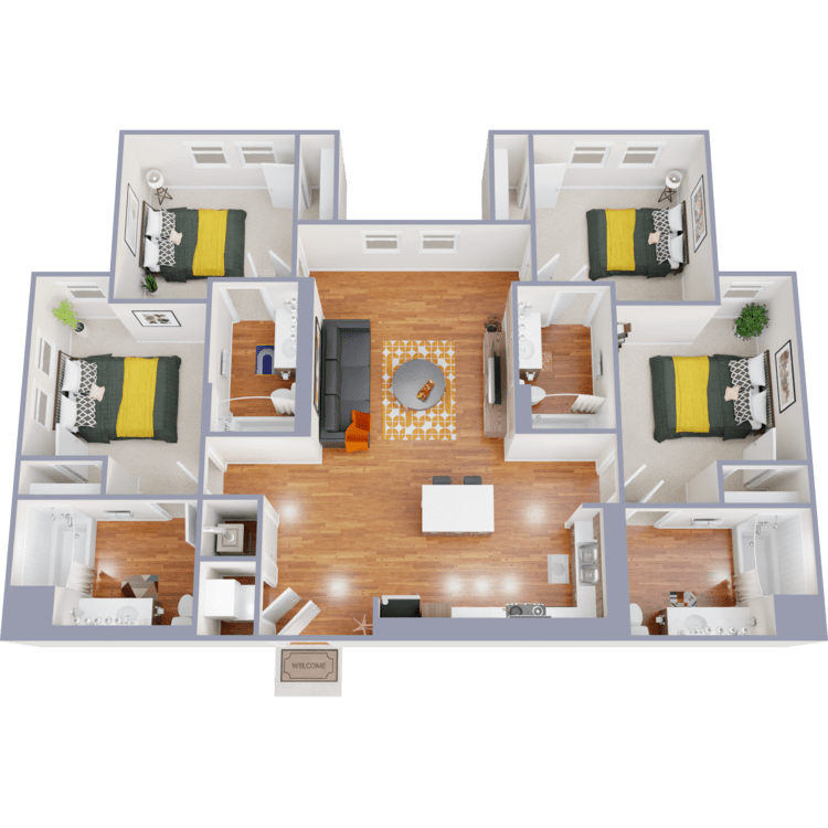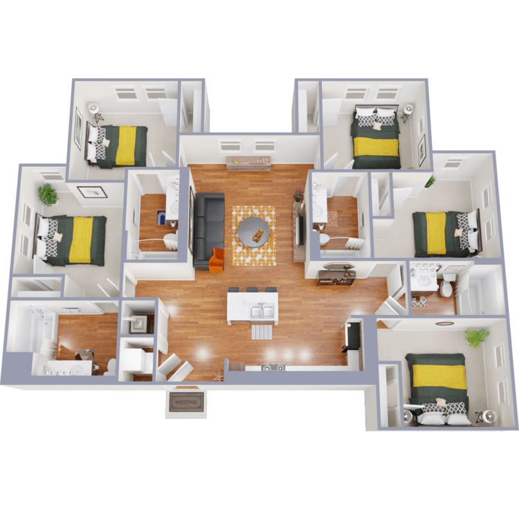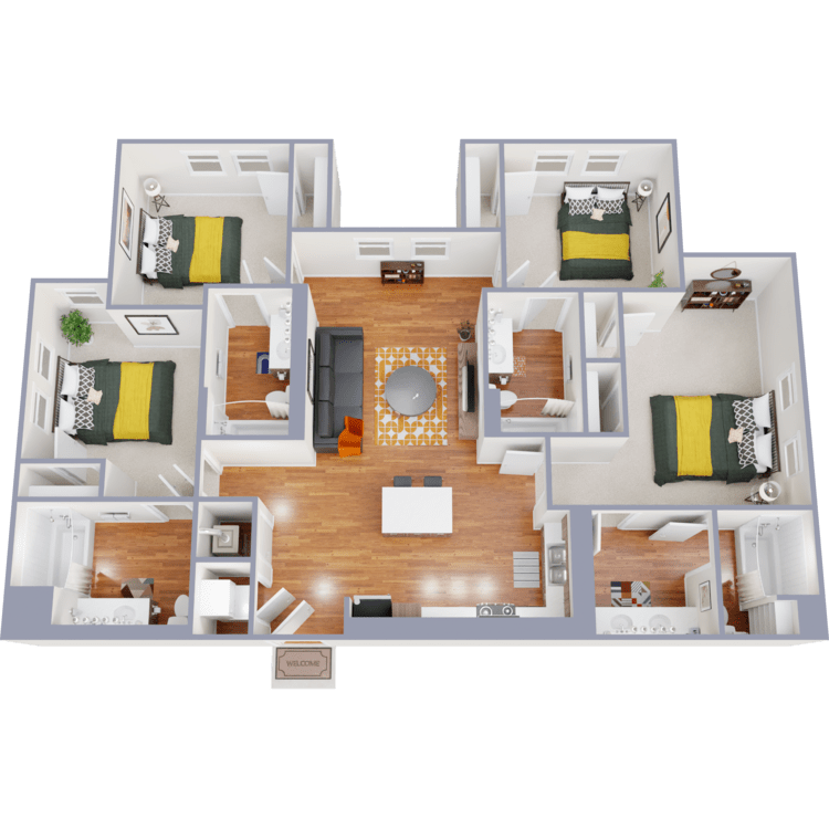 Our thoughtfully designed furnished apartments for rent provide students with the space and features to thrive, from in-home washers and dryers to kitchens equipped with refrigerators and dishwashers. Our student housing is also fully furnished, so you can settle in with ease and focus on your studies. Choose from our thirteen different studio, one, two, three, four, and five-bedroom floor plans; there’s a space that feels just right for you.